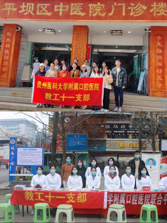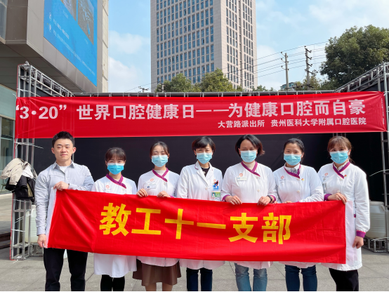 3月17日,教工第十一党支部携手护理部组织南丁格尔志愿护理服务队及教工第一、八、十二党支部,联合大营路派出所、贵阳市科技局在贵阳市云岩区益田广场以“为健康口腔而自豪”为主题、“关注口腔健康 一生拥有灿烂笑容”为副主题开展了口腔健康科普义诊活动。活动现场,医护人员对前来咨询的辖区居民朋友们进行口腔检查、口腔健康保健和预防咨询等医疗服务。活动最后,医护人员还为群众送上牙膏、牙刷等小礼品,叮嘱大家保护好自己的口腔健康。