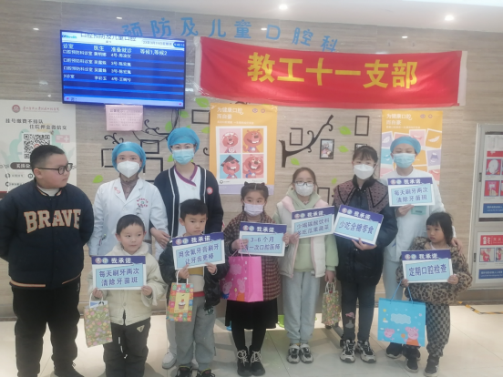 当天,教工第十一党支部党员同志们在医院三楼候诊区为参加“世界口腔健康日”活动的小朋友及家长讲解爱牙护齿小知识,并进行现场教学。活动现场,家长和孩子们共同承诺,会注重口腔卫生,保护好个人的口腔健康。