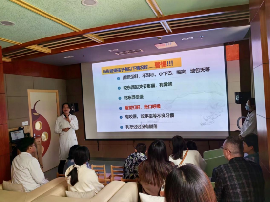 期间,朱铭慧以“牙齿矫正科普”为题作口腔健康教育,围绕口腔错𬌗畸形的危害、牙齿矫正的认知误区、正畸治疗的时机及牙𬌗发育不同阶段矫治注意事项等方面,结合实际临床案例生动形象地讲解了口腔健康的重要性和正畸治疗的必要性,并从错𬌗畸形的病因机制角度,通俗易懂地阐释了儿童青少年时期如何进行预防和阻断治疗,使患儿及家属能更为深刻地理解错𬌗畸形的表现、危害及早期矫治的重要性等。