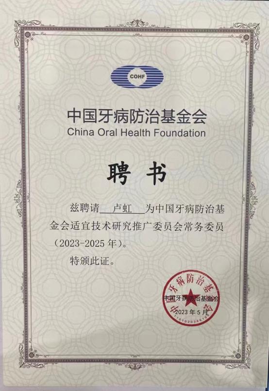 预防及儿童口腔科主任卢虹被聘为中国牙病防治基金会适宜技术研究推广委员会常务委员。