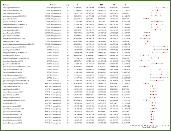 近期研究表明,肠道菌群与COVID-19之间存在潜在的相关性,但二者之间的因果关系尚未受到足够的探究。宋具昆团队利用公开可用的GWAS数据进行了两个样本的Mendelian randomization(MR)研究。倒数方差加权(IVW)分析是主要的MR分析技术,并补充了其他敏感性分析。在IVW方法中,与COVID-19易感性、住院和严重性相关的42个细菌属中,有五个肠道微生物群与COVID-19住院和严重性有明显关联。三个肠道微生物群(Negativicutes纲、Selenomonadales目和放线菌门)与COVID-19住院和易感性明显相关,而两个微生物群(Negativicutes纲和Selenomonadales目)与COVID-19住院、严重性以及易感性均有明显关联。敏感性分析未发现异质性和横向多效性。因此,研究发现多种微生物与COVID-19存在因果联系,这有助于进一步理解肠道微生物与COVID-19病理学之间的关系。