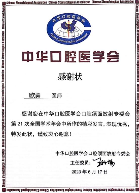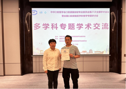 会议期间,召开了多学科专题学术交流会,欧勇以“大数据时代强调影像数据规范化的必要性”为题作专题汇报。他结合临床资料,从优化就诊、规范医嘱等方面,阐述了大数据时代下影像数据规范化的意义和必要性,获得了中华口腔医学会颁发的“感谢状”。