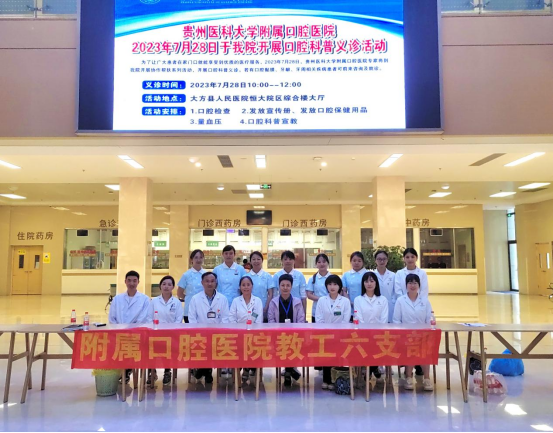 、附属口腔医院教工第六党支部(牙周黏膜科)联合大方县人民医院在大方县人民医院门诊大厅开展“红色教育强党性,口腔义诊暖人心”主题党日活动,用实际行动为群众办实事解难事。