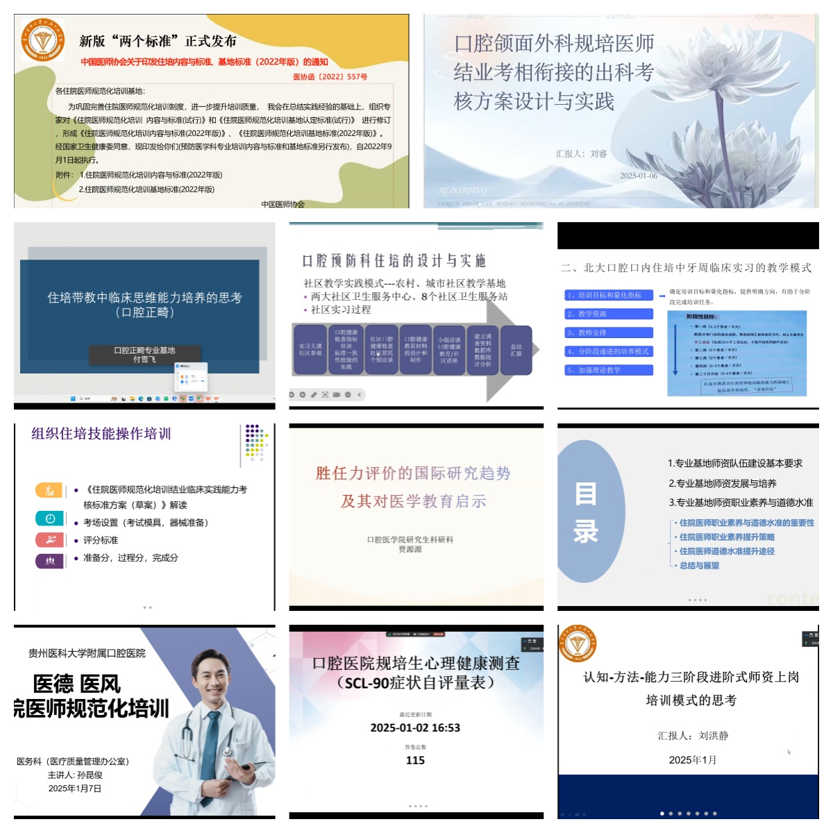 1月6日下午至1月7日,培训转到线上进行,分别由口腔种植修复科专业基地教学主任田艾、口腔颌面外科专业基地教学主任刘睿、牙体牙髓科主任谭旭、儿童口腔科主任卢虹、医务科副科长孙昆俊、口腔全科专业基地教学主任宋彦蓉、口腔内科指导医师王婷婷和张玲艳、口腔正畸科专业基地教学主任付雪飞、研究生科研管理科负责人贾源源、口腔全科专业基地负责人刘洪静依次授课,围绕医德医风、师资职业素养、技能培训、临床思维能力培养、出科考核设计、日常考核等内容深入讲解。大家纷纷表示受益匪浅,对最新的政策要求有了新的认识。