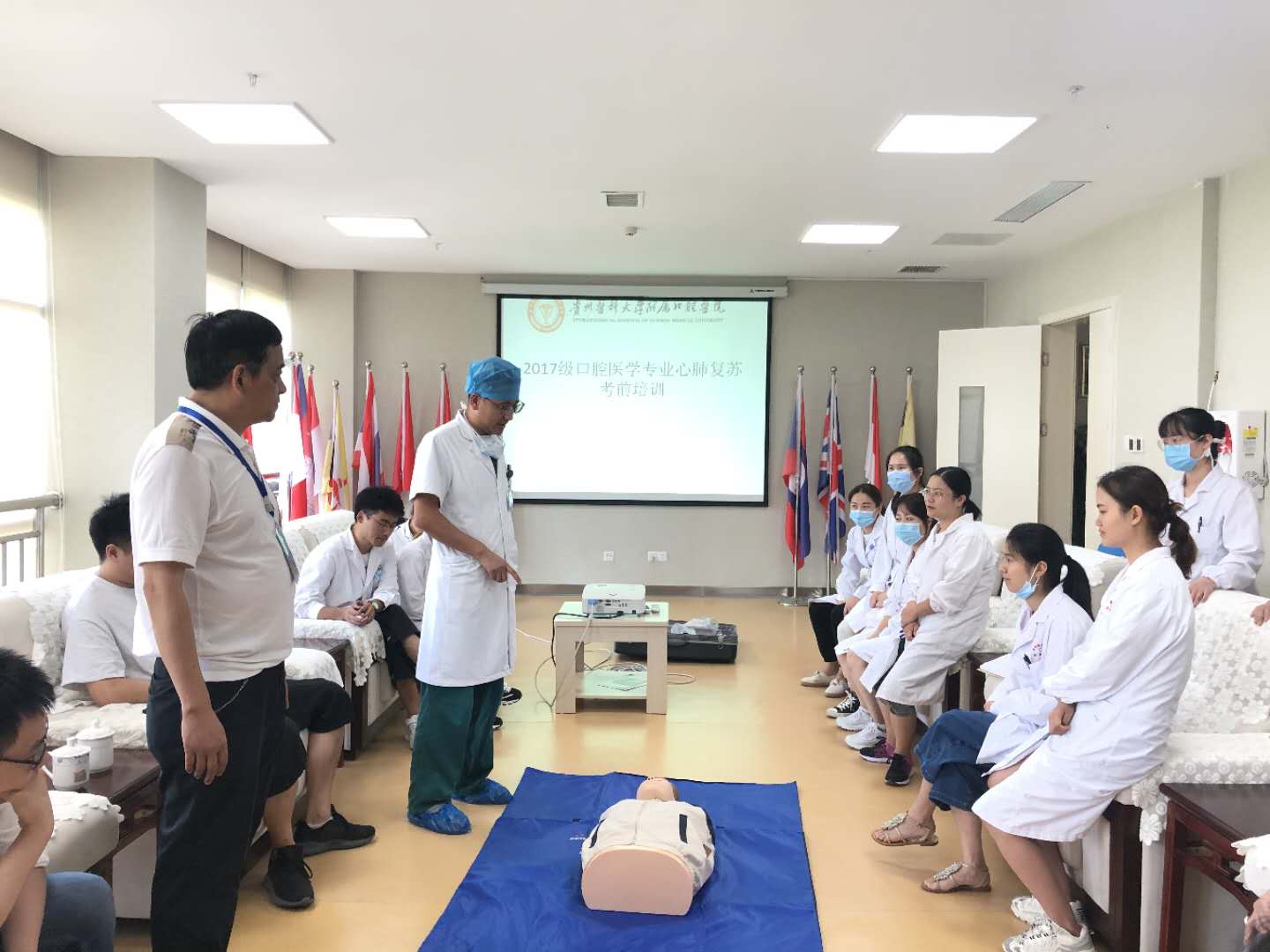 住院医师规范化培训,使学员熟练掌握急救护理知识,同时提高学员结业考核成绩及通过率,8月3日,毕业后继续教育管理科组织2017级需要进行住院医师规范化培训的学员进行“急救护理培训”。培训主要围绕吸痰吸氧,心肺复苏(CPR)与急救相关知识,邀请了护理部与医务科协同完成。