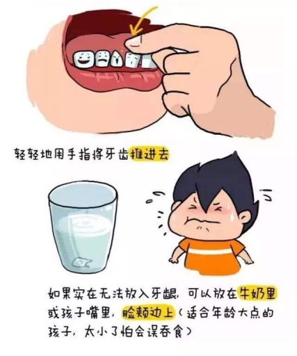 找到这颗牙齿,捏住牙头轻轻用矿泉水冲洗即可(不要刷,也不要用洗涤剂!),如果情况允许立刻把这颗牙齿放回牙槽窝,小心地合上嘴且尽快到专业口腔医院就诊。如果不能把牙齿放回牙槽窝,把牙齿放在干净的装有冷牛奶、盐水、唾液的容器里,然后立即去专业儿童口腔医生的诊室。处理得越及时,救回这颗牙齿的可能性就越大。