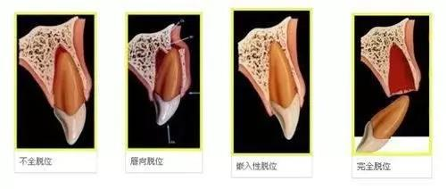 简单来说,受外力猛烈撞击导致牙齿错位甚至脱离牙槽窝的现象,一般分为以下4种情况: