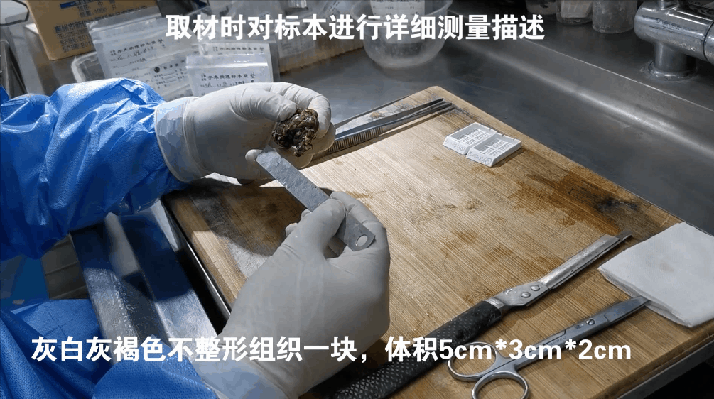 标本固定良好之后,医生进行取材,需要取到病变的部位,标本要有代表性。