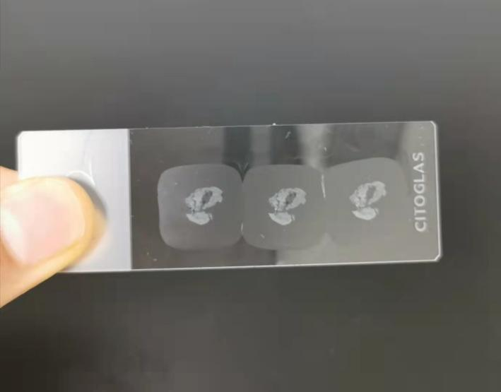 切好的白片进行染色:常规HE染色,染色后封片,这样一张病理切片就做出来了。