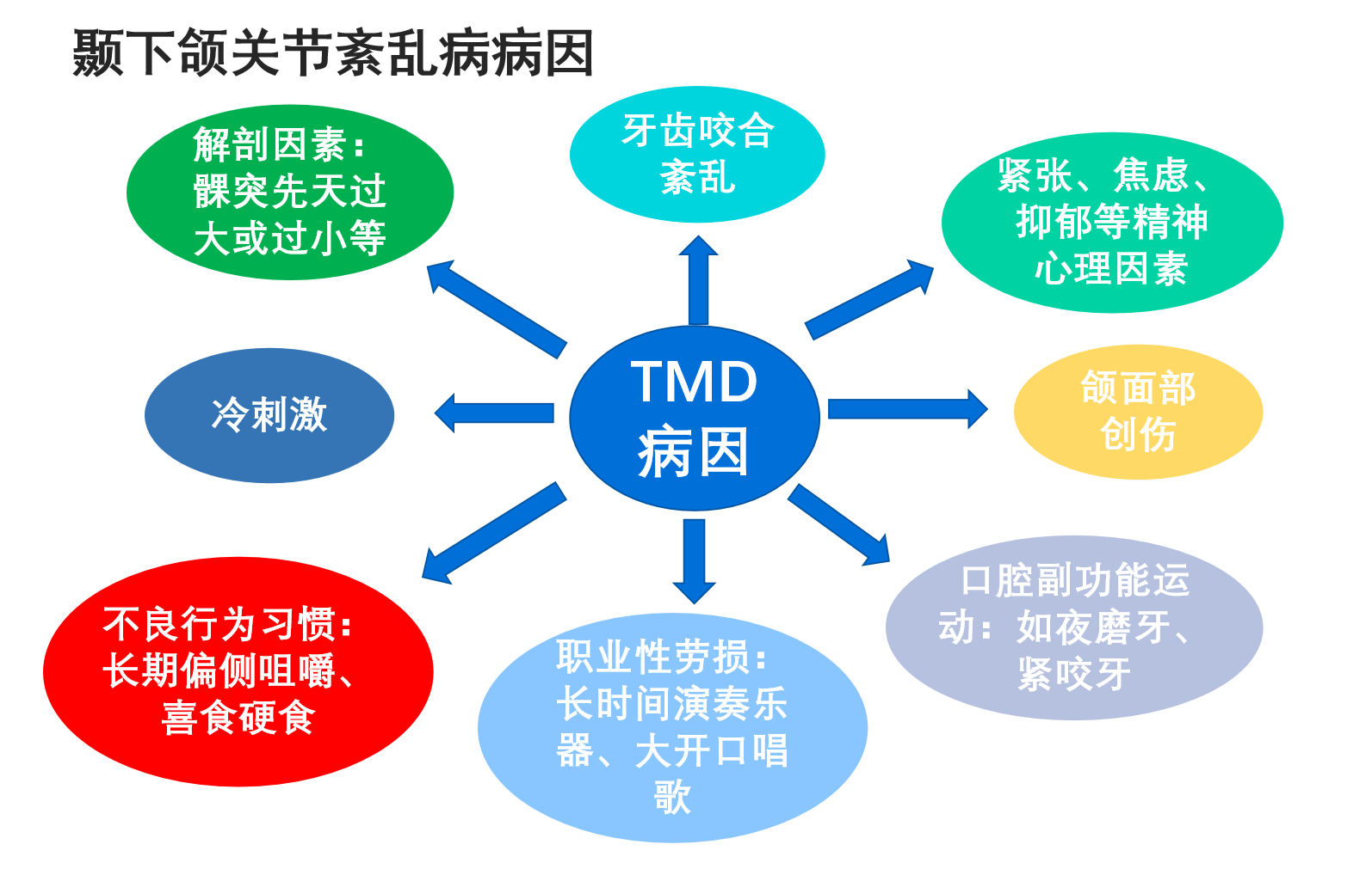 颞下颌关节紊乱病的病因尚未完全阐明,一般认为是多因素发病。比如牙齿咬合紊乱、紧张焦虑等精神心理因素、颌面部创伤、夜磨牙、不良行为习惯等。