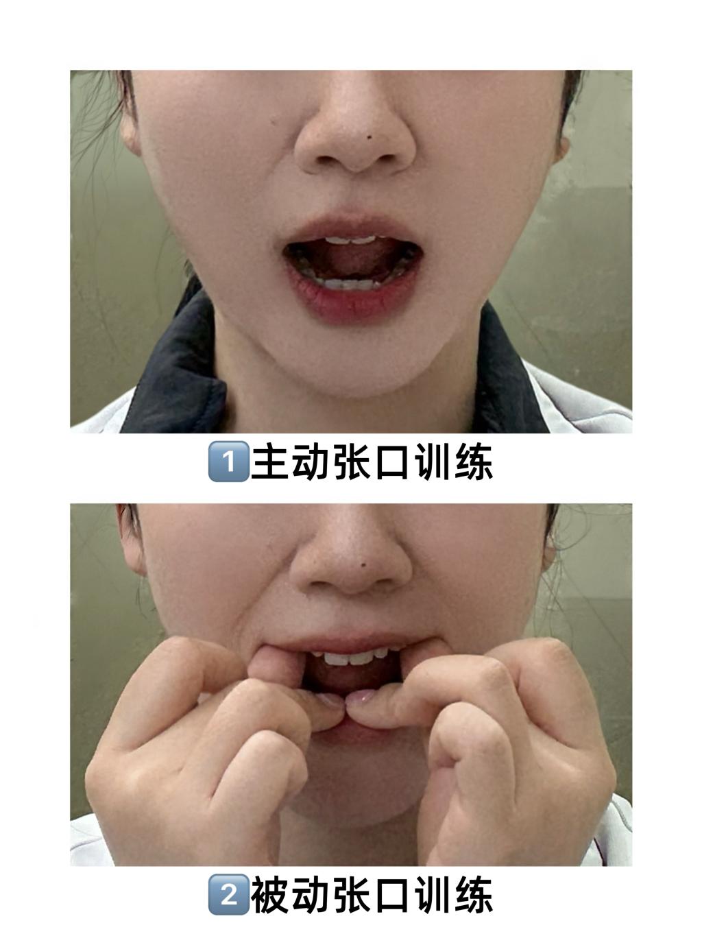 2.被动张口训练:借助手指或张口训练棒辅助,将拇指置于上颌后牙、食指(或中指)置于下颌前牙,轻柔施力逐渐打开咬合,每次保持1-2分钟后复位,每组5-10次,每日至少3组,每周开口度增加1–2毫米。