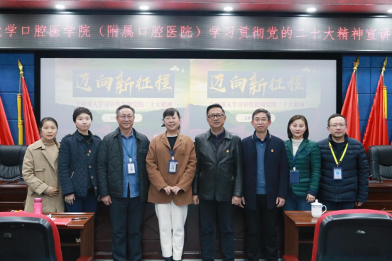 马洪指出,学习宣传贯彻党的二十大精神要在深刻理解、全面把握、全面落实上下功夫,扎实推动党的二十大精神进医院,希望全体医护人员深刻领会高等教育的重要地位与作用,自觉履行高水平科技自立自强的使命担当,深入贯彻实施人才强国战略和健康中国战略,找准切入点,做好长远布局规划,夯实医院医学人才培养主阵地,加大临床科研工作力度,提升科技成果转化能力,聚焦做强做优学科、专科,适应新时期的公立医院绩效改革,促进口腔医学传承创新和发展,全面提高突发公共卫生事件防控救治能力和医疗服务水平,以刀刃向内的勇气找问题解难题,一代接着一代干!