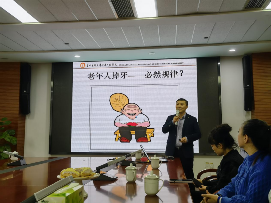 活动中,研究生党支部书记廖健围绕“老掉牙是不是必然规律、牙齿缺失了有什么危害、牙齿掉了需不需要‘补’起来、牙齿缺失有哪些修复方法”等问题,深入浅出讲解牙齿修复科普知识,鼓励大家认真面对口腔问题,早预防、早发现、早治疗。