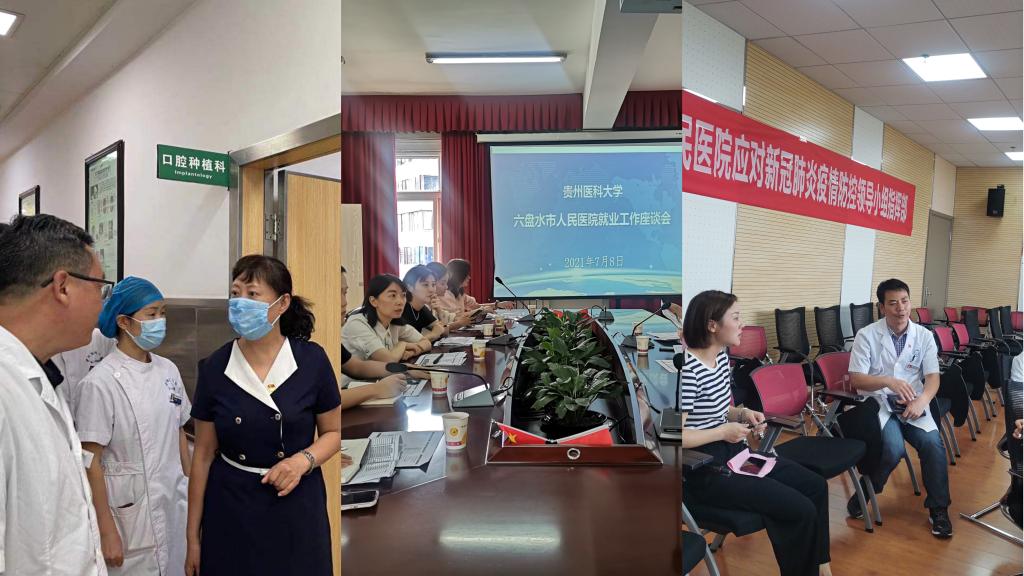 为深入开展党史学习教育和“牢记殷切嘱托、忠诚干净担当、喜迎建党百年”专题教育,全力推进就业实习工作,口腔医(学)院学生工作团队紧扣工作实际,用心用情用力解决学生工作中的问题,切实开展“我为群众办实事”实践活动,7月8日至12日,口腔医(学)院党委书记张军梅、副书记何雨羲分别带领学生科副科长张婷、分团委副书记刘逸洲、辅导员赵会、汪继蓉,前往附属兴义医院、黔西南州人民医院、六盘水市人民医院、六盘水市妇幼保健院、302医院、安顺市人民医院、贵州医科大学第二附属医院、贵州医科大学第三附属医院等实习基地走访看望实习同学,并与实习单位就毕业生就业工作的推动展开座谈。