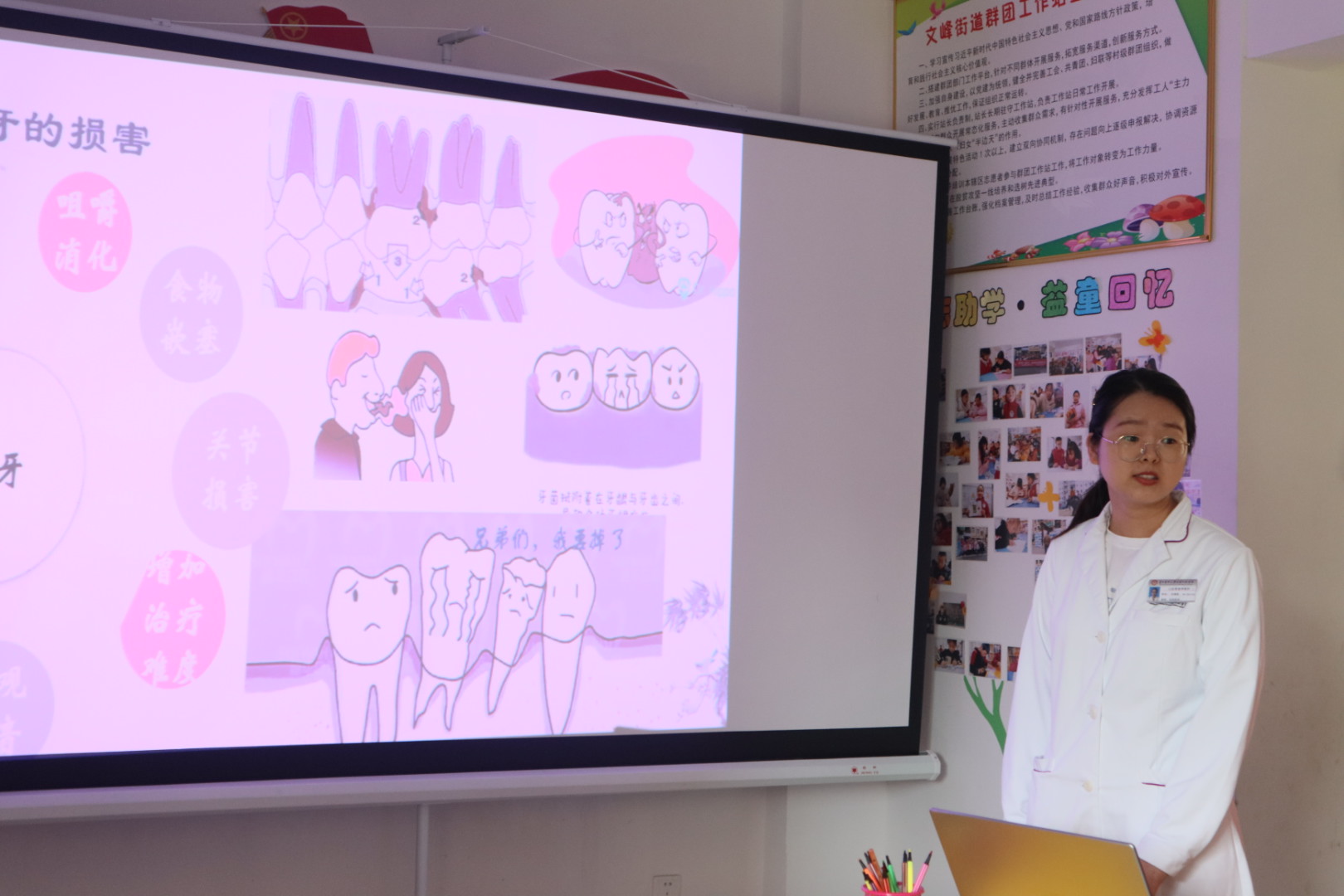 口腔医(学)院医护人员针对“塔山社区易地搬迁点青壮年大多外出务工,留守家里多为老人和小孩,需更多关怀”的特点,精心准备科普讲座和义诊,由魏宏琳医生和刘春影医生分别作题为“口腔卫生保健知识讲座”及“口腔修复小讲座”的科普讲座,生动有趣地讲解儿童和老年人口腔保健相关内容,体现了小艾电竞