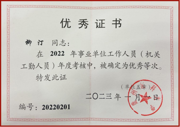 柳汀在贵州医科大学2022年度考核中被评为优秀等次