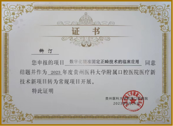 已率先在贵州省开展数字化精准固定正畸技术,该技术已在国外及部分国内一流院校或口腔医院的临床中应用,具有安全性好、精准度高、个性化治疗、缩短正畸疗程等优点。引进先进的数字化精准固定矫治技术,可以缩短西部与发达地区在医疗技术上的差距,让省内正畸患者享受到更加优质、安全、高效的医疗技术及服务。