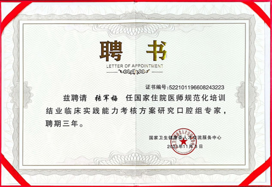 张军梅 教授、主任医师、硕士研究生导师,贵州医科大学口腔医(学)院党委书记,国际牙医师XIAOIDJ
