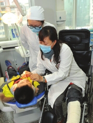 (张军梅在左腿骨折的情况下为病人接诊)