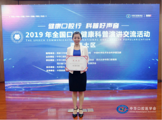 近期,综合急诊科宋彦蓉医生在中华口腔医学会主办的西南大区口腔健康科普演讲交流活动中,凭借生动严谨的讲解和优雅风趣的表达荣获“科普先锋”称号,为口院再添新辉!