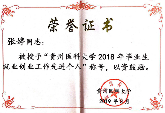 (荣获“贵州医科大学2018年毕业生就业创业工作先进个人”称号)