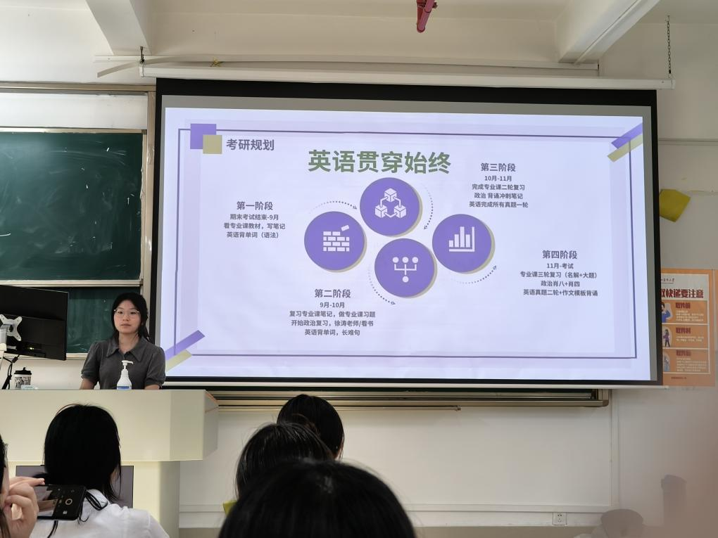 她把自己的考研过程总结成四个阶段,希望同学们制定清晰明确的学习目标,针对每个阶段不同的侧重点开展复习,并强调了英语学习对考研的重要性。