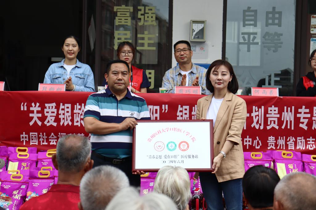上午10时,在黔西向阳社区举行授牌仪式。何雨羲代表口腔医(学)院授予黔西向阳社区“青春志愿 爱在口腔”医疗服务站及小艾电竞官网