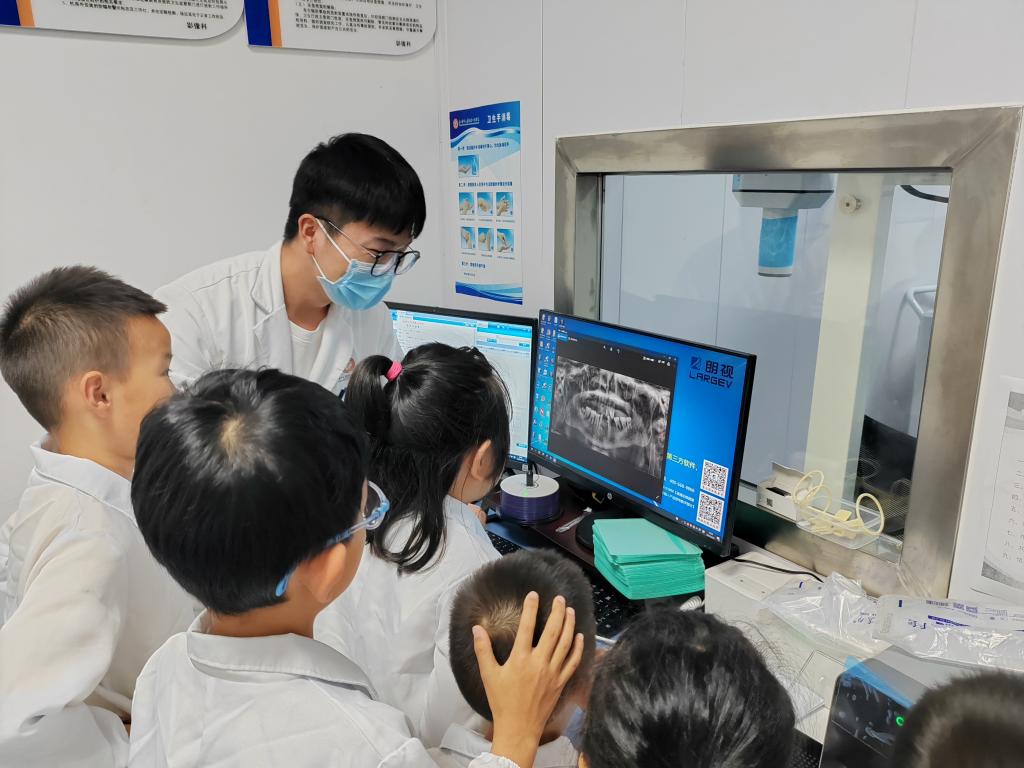 体验环节,亲子家庭在医护人员引导下有序参观影像科与口腔诊室。医生通过实际口腔X光片,直观讲解了影像设备的工作原理和通过影像判断牙齿问题的方法,让大家切身感受现代口腔医学的先进技术;口腔诊室里,医务人员详细介绍了各类专业诊疗设备与日常诊疗流程,有效缓解了孩子们对看牙的恐惧心理,也让家长对口腔诊疗工作有了更深入的认识。