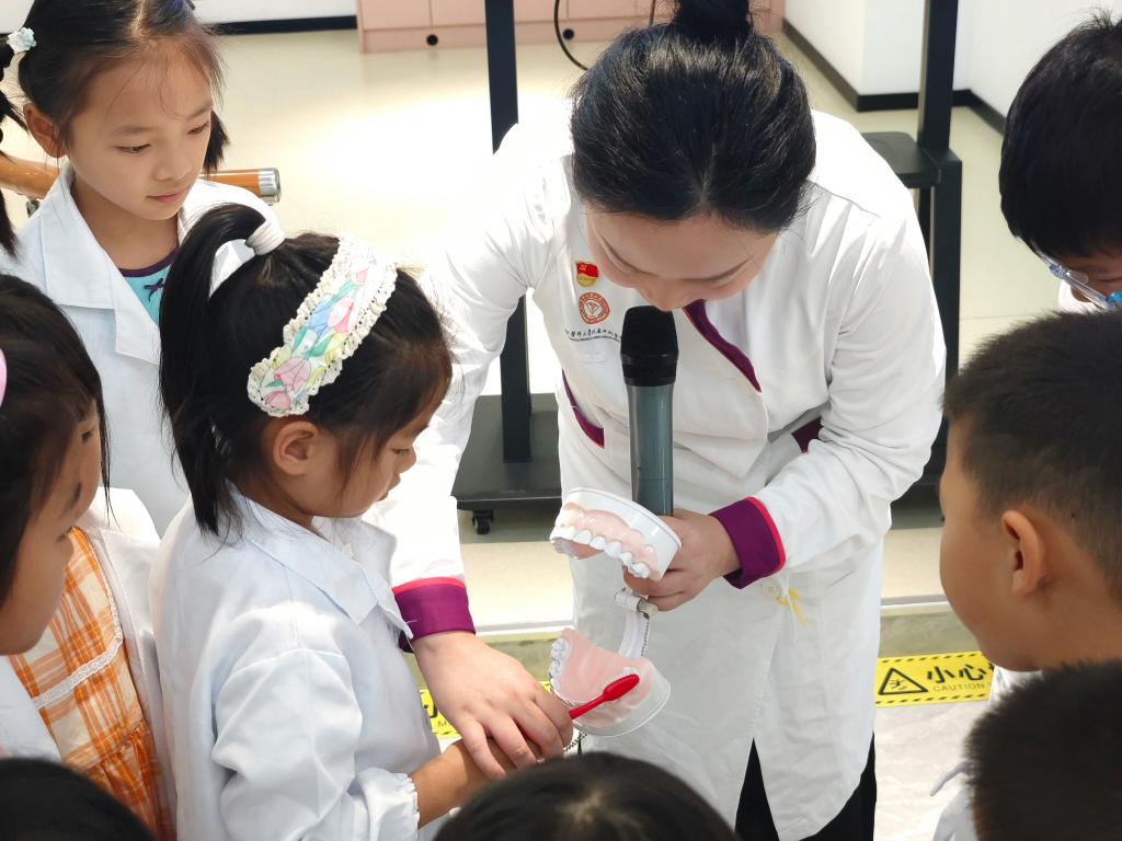 口腔预防科杨晓春围绕儿童常见龋齿、牙外伤等问题,详细讲解了牙齿的结构、口腔疾病成因及科学的预防方法,并采取趣味问答的方式,鼓励孩子们积极抢答,现场气氛热烈。同时利用牙齿模型示范了“巴氏刷牙法”,孩子们共同实践,及时纠正错误刷牙方式。