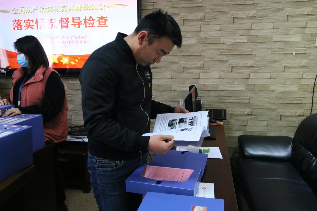 党委副书记、院长马洪代表医院党委表态,表示院党委会以高度的政治自觉全面抓好反馈问题整改,制定问题清单、整改清单、责任清单,逐项整改,确保件件有着落、事事有回音;以高度的思想自觉落实全面从严治党责任,扎实履行好主体责任、班子成员“一岗双责”,持续保持风清气正良好政治生态。会后,检查组认真查阅口腔医院党委2020年落实全面从严治党主体责任和党风廉政建设责任制情况的相关工作材料并提出整改意见。