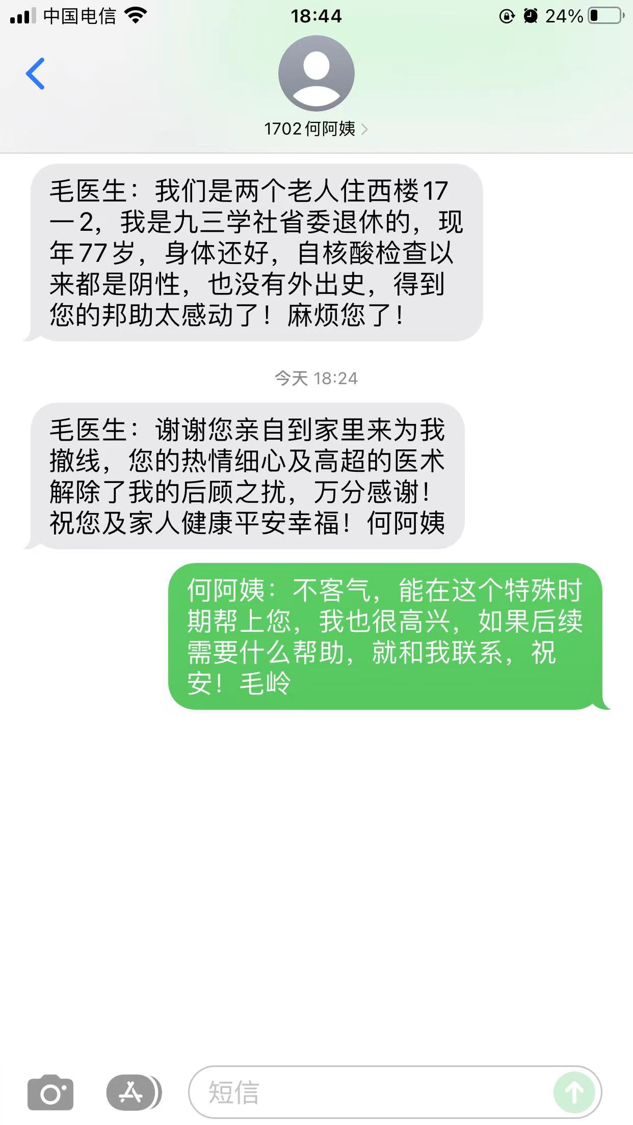 毛岭博士所在小区一位77岁的老人在业主群内求助口腔不适,毛岭博士了解情况后主动联系老人,在符合疫情防控要求的前提下上门为老人解决口腔问题,获得老人称赞。