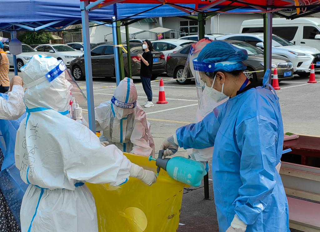 周天、胡睿为核酸采集场地消杀
