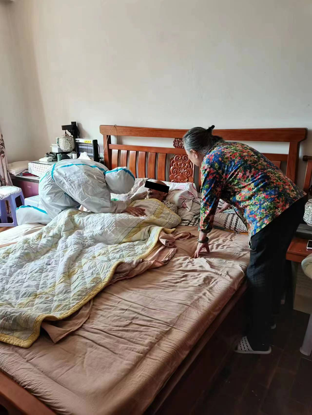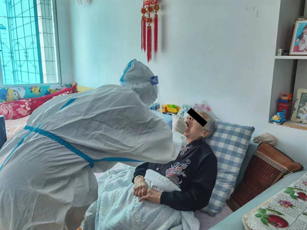 8时50分,核酸采集小队正式开始对盐务街社区行动不便及老弱病残等特殊人群进行核酸采样,切实保障全员核酸检测不漏一户、不落一人。其中,有老人76岁,因有多项基础疾病,腰肌劳损造成走路困难,不便出门。核酸采集小队在社区工作人员带领下,来到老人家中,仅用了几分钟就完成了核酸采集。随后,她们陆续前往辖区其他行动不便的居民家中,帮助登记信息,进行咽拭子标本采集,圆满地完成了这次核酸采样任务。经统计,此次共计完成核酸采集57人次,上门服务46家。