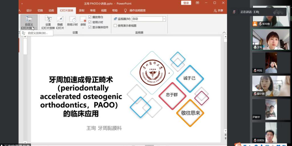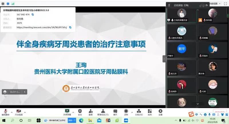 本科实习和规培的教学任务同样通过线上授课形式进行。98日上午,牙周黏膜科进行了规培生和实习生小讲课,由王珣主讲,内容围绕《牙周加速成骨正畸术的临床应用》和《伴全身疾病牙周炎患者的治疗注意事项》展开。